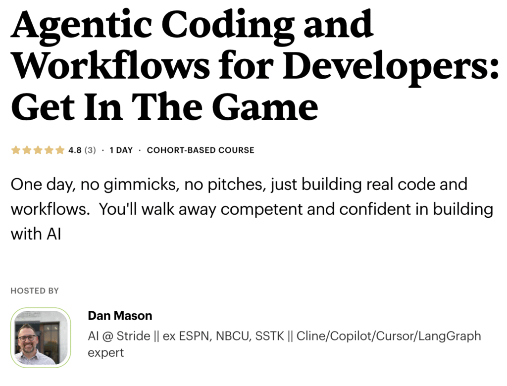 This is a workshop that I’ve delivered both for corporate clients, and to public cohorts on Maven; here’s a related free 30 min Lightning Lesson on agentic coding from July, and another on agentic workflows from August. Check Maven to see if there’s a cohort coming up, or feel free to contact me directly. Thanks!